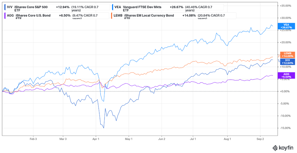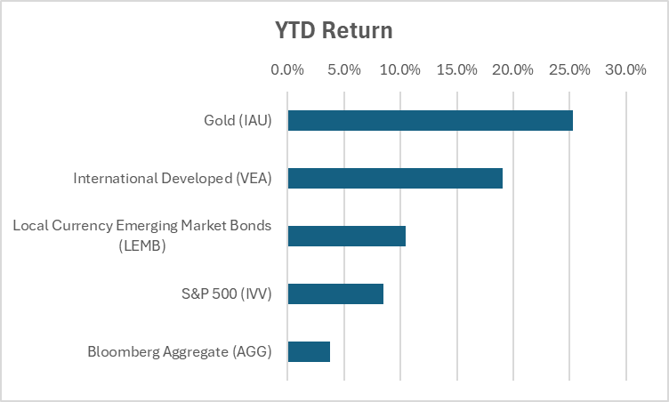 Is a period like the start of 2001 possible? Where investors in international stocks strongly outperform those exclusively featuring stocks in the USA. Here are year-to-date returns for 2025 through today’s close. After falling -15% the S&P 500 rallied back strongly to be up 12%. International stocks barely dipped below par and are now up 27% year-to-date. Déjà vu? Even local currency emerging market bonds are outperforming the S&P 500 with a lot less volatility and downside risk.