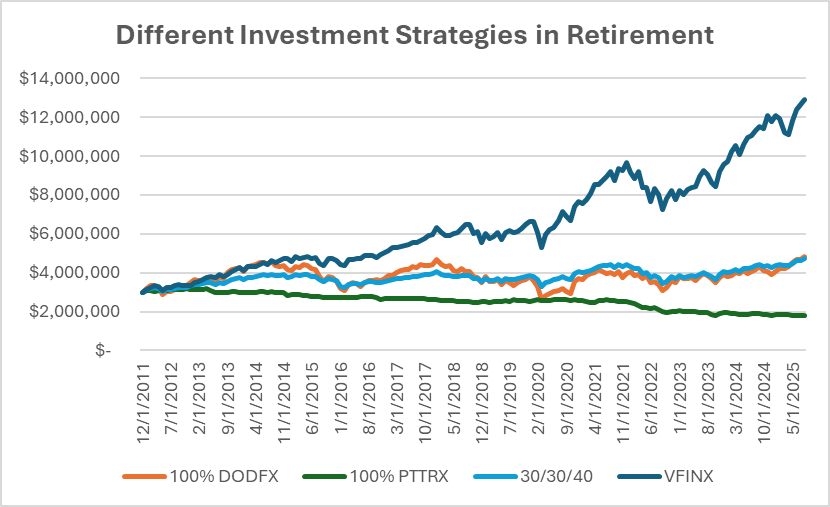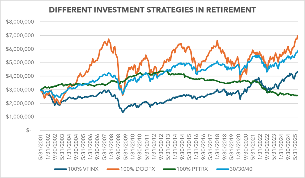 Each investor in our study retires on April 30, 2001 with a $3,000,000 portfolio. For simplicity, we assume the money is invested in tax-deferred accounts so that we can ignore them. One investor invests 100% in the S&P 500 (VFINX). Another invested 100% in international developed stocks (DODFX). A third, the most conversative, invested in 100% bonds (PTTRX). Finally, our balanced investors, placed their money 30% in the S&P 500, 30% in international stocks, and 40% in bonds. How did they all do?