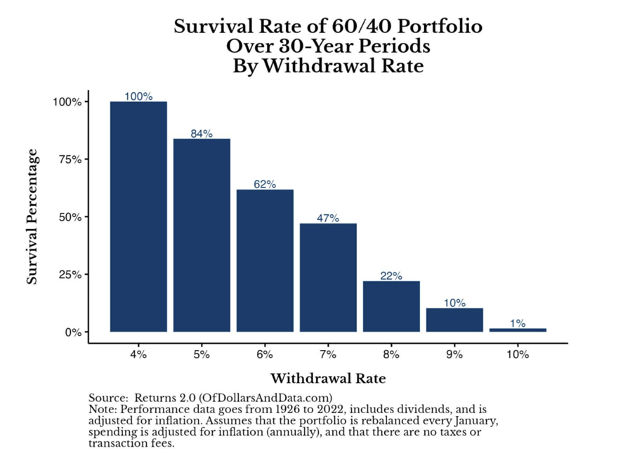 The 4% withdrawal rule is a bedrock principle of financial planning for a reason. The central idea is that when you have accumulated enough in assets to draw 4% a year, increased by 3% each year to cover inflation, you can retire. In other words, when you have 25x your annual expenses saved. Personal Finance author Nick Maggiulli found a 100% probability, historically (1926 to 2022), that a 4% withdrawal rate was sustainable in retirement.